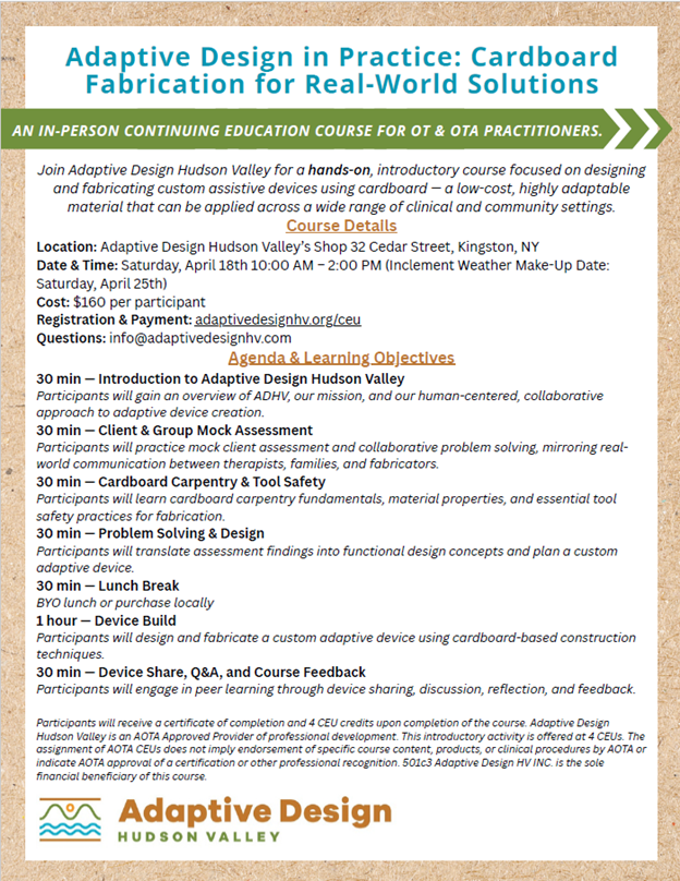 Adaptive Design Hudson Valley offers four-credit CEU sessions for occupational therapists